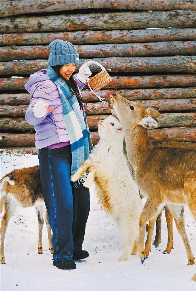 12月16日,游客在抚松县长白山华美胜地国家级度假区的萌宠乐园与小动物互动。